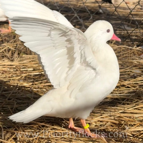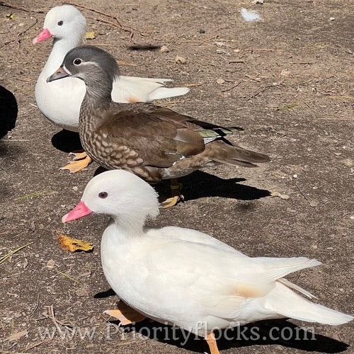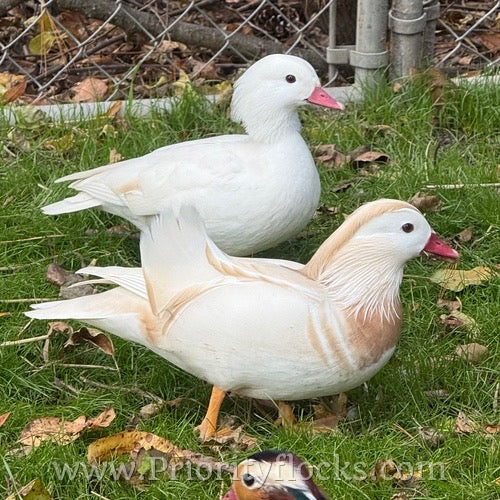 Their bright white feathers contrast beautifully against natural pond settings, making them a standout addition to ornamental collections. Drakes still develop the classic Mandarin shape and posture during breeding season, though in a refined all-white presentation.