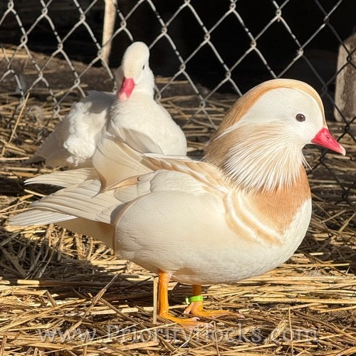 The White Mandarin is a striking color mutation of the traditional Mandarin Duck, offering the same elegant structure and personality with a completely white plumage.