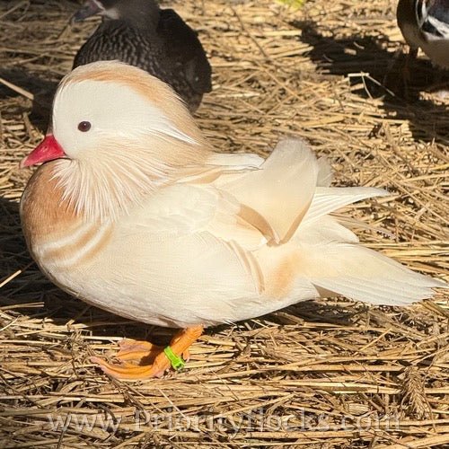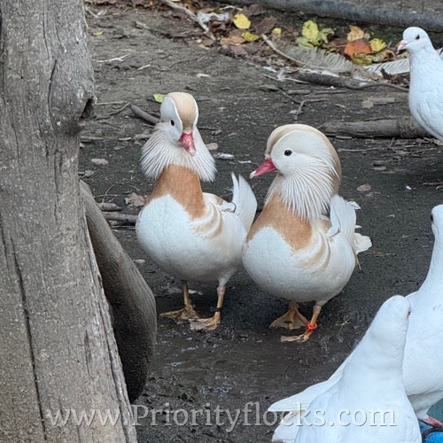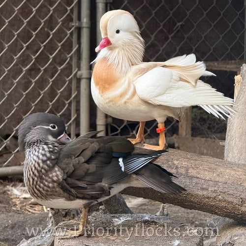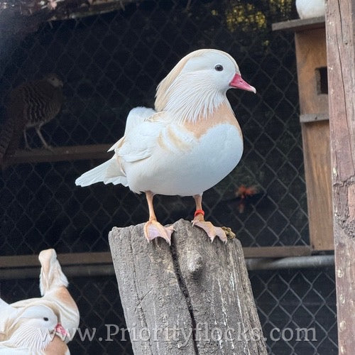 Like their wild-type counterparts, White Mandarins are active flyers and do best in secure aviaries or enclosed waterfowl environments. They are highly sought after by collectors looking for something rare and visually refined.