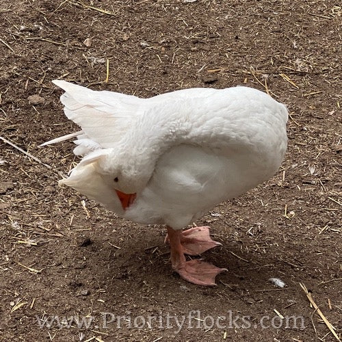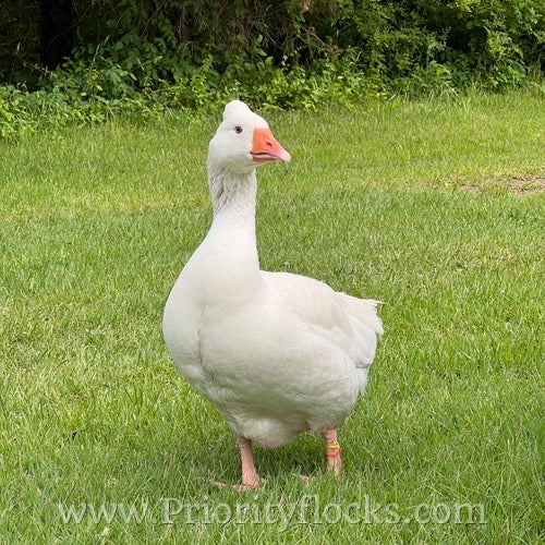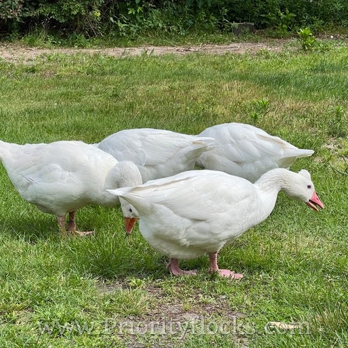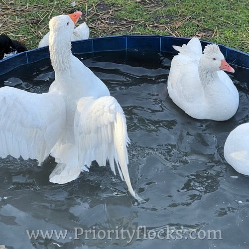 Roman Tufted Geese are a historic European breed recognized by its rounded crest and bright white plumage. Smaller than many other goose breeds, Romans are ideal for ornamental programs and smaller pasture setups while still offering strong fertility and classic presence.